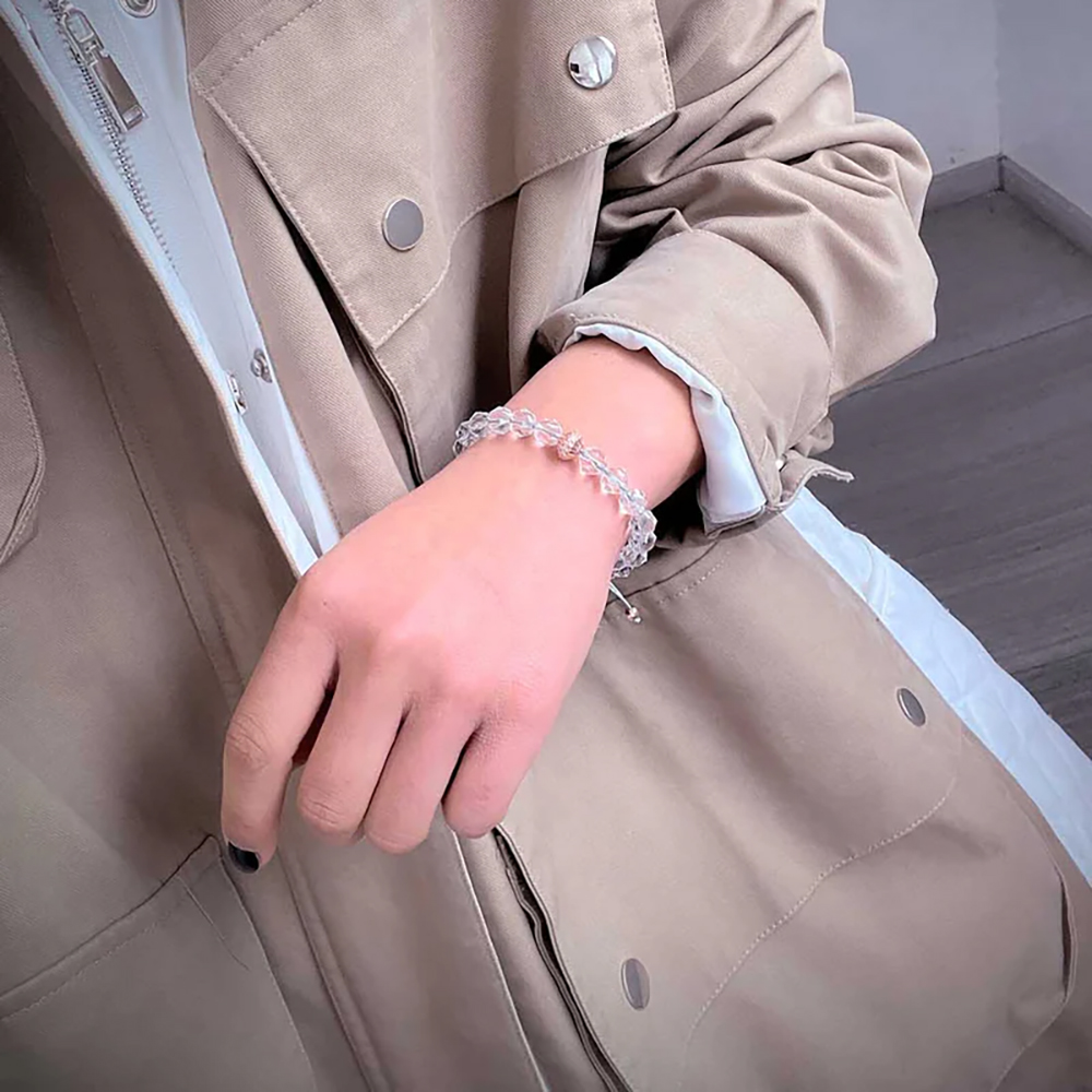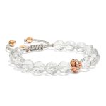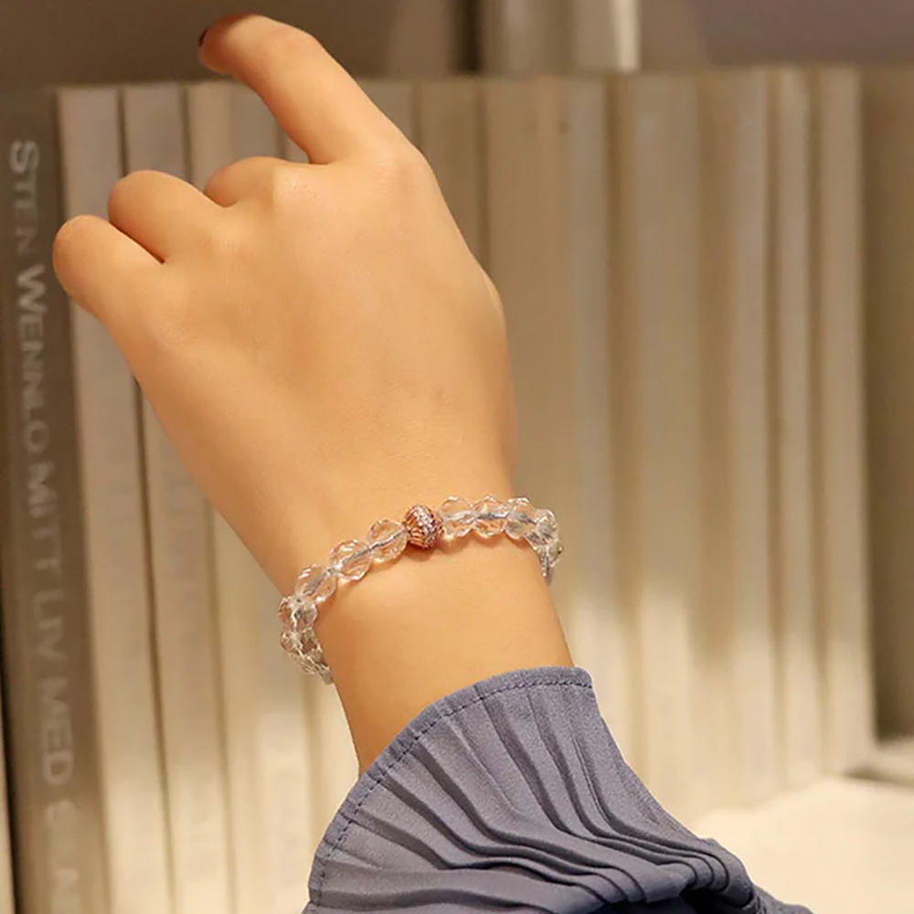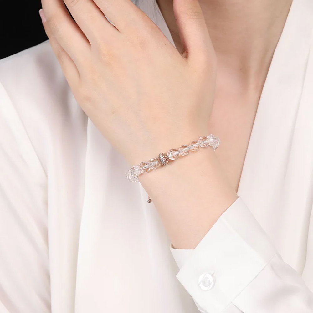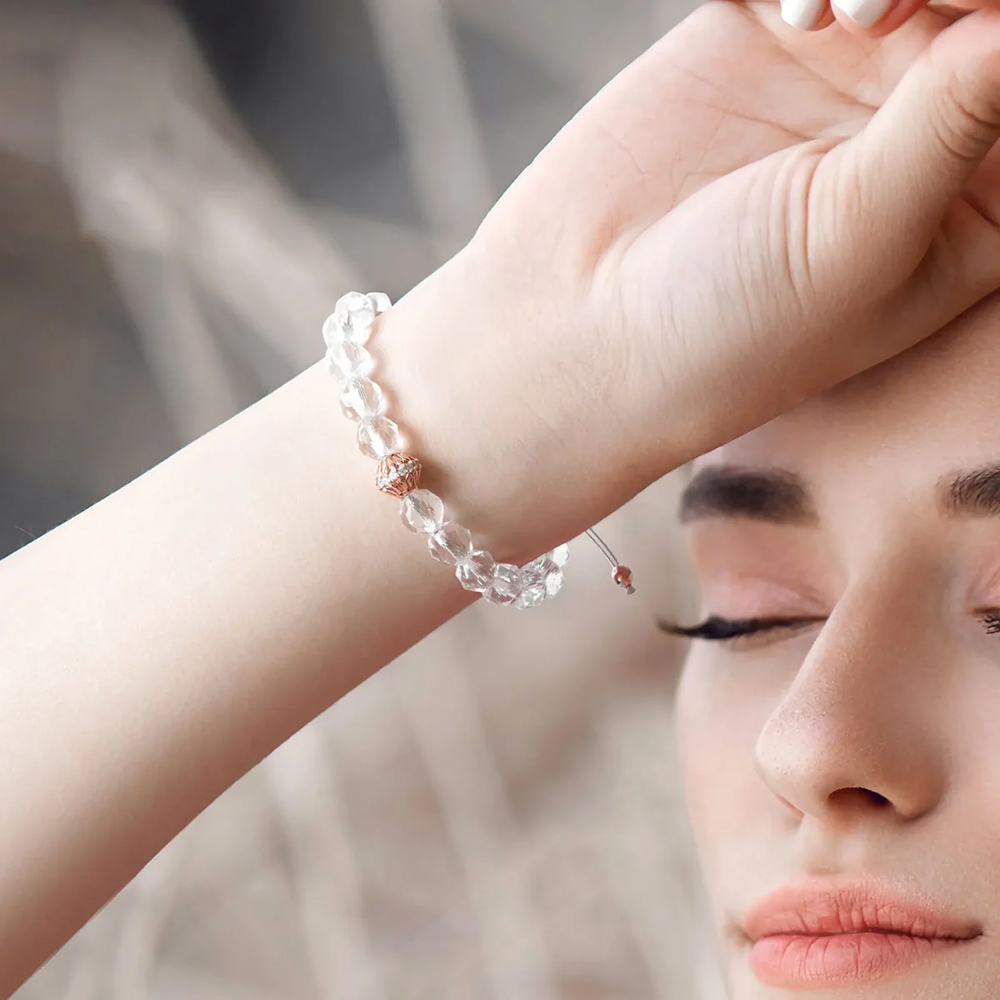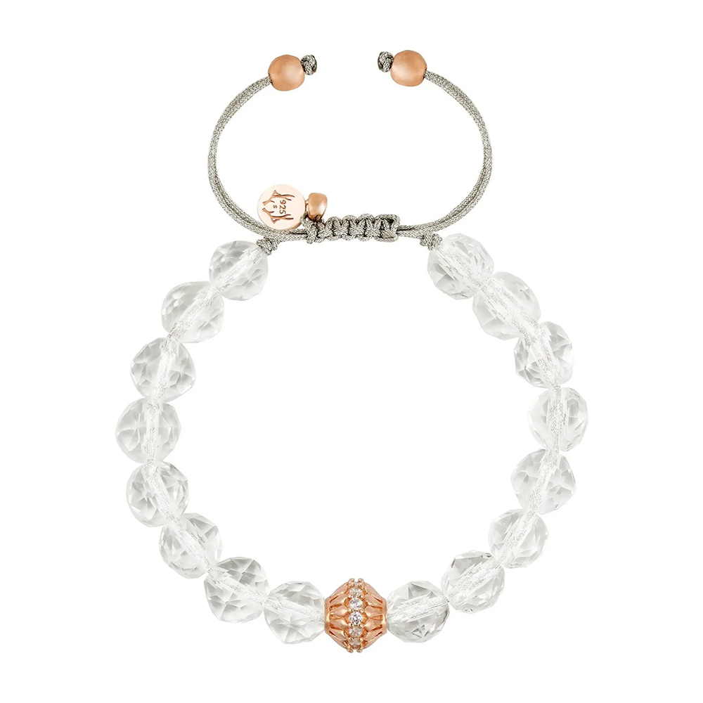 Crafted with attention to detail, the bracelet features Brazilian clear quartz beads with an eight millimeter diameter, paired with a rose gold toned S925 silver accent. A woven adjustable sliding clasp ensures a comfortable and flexible fit for everyday wear.