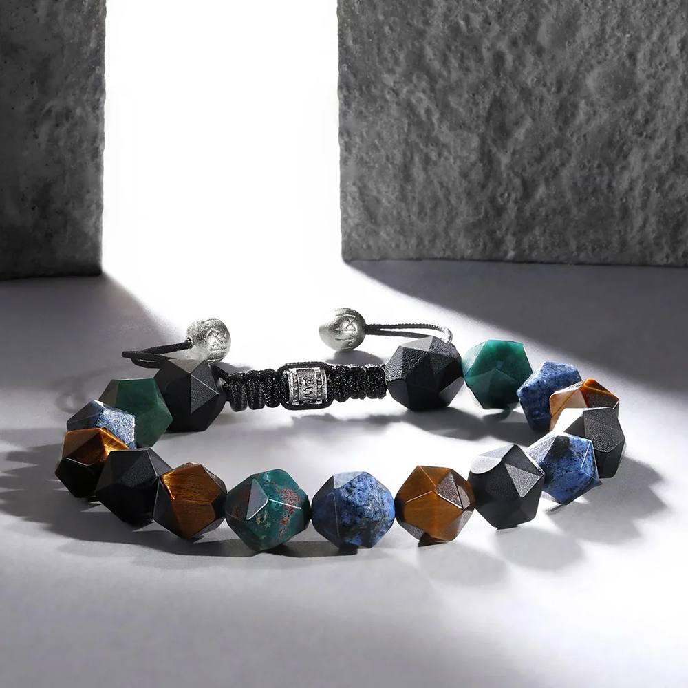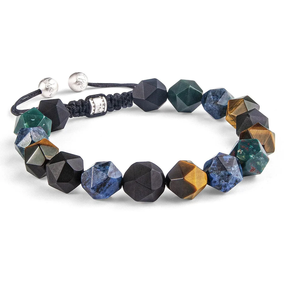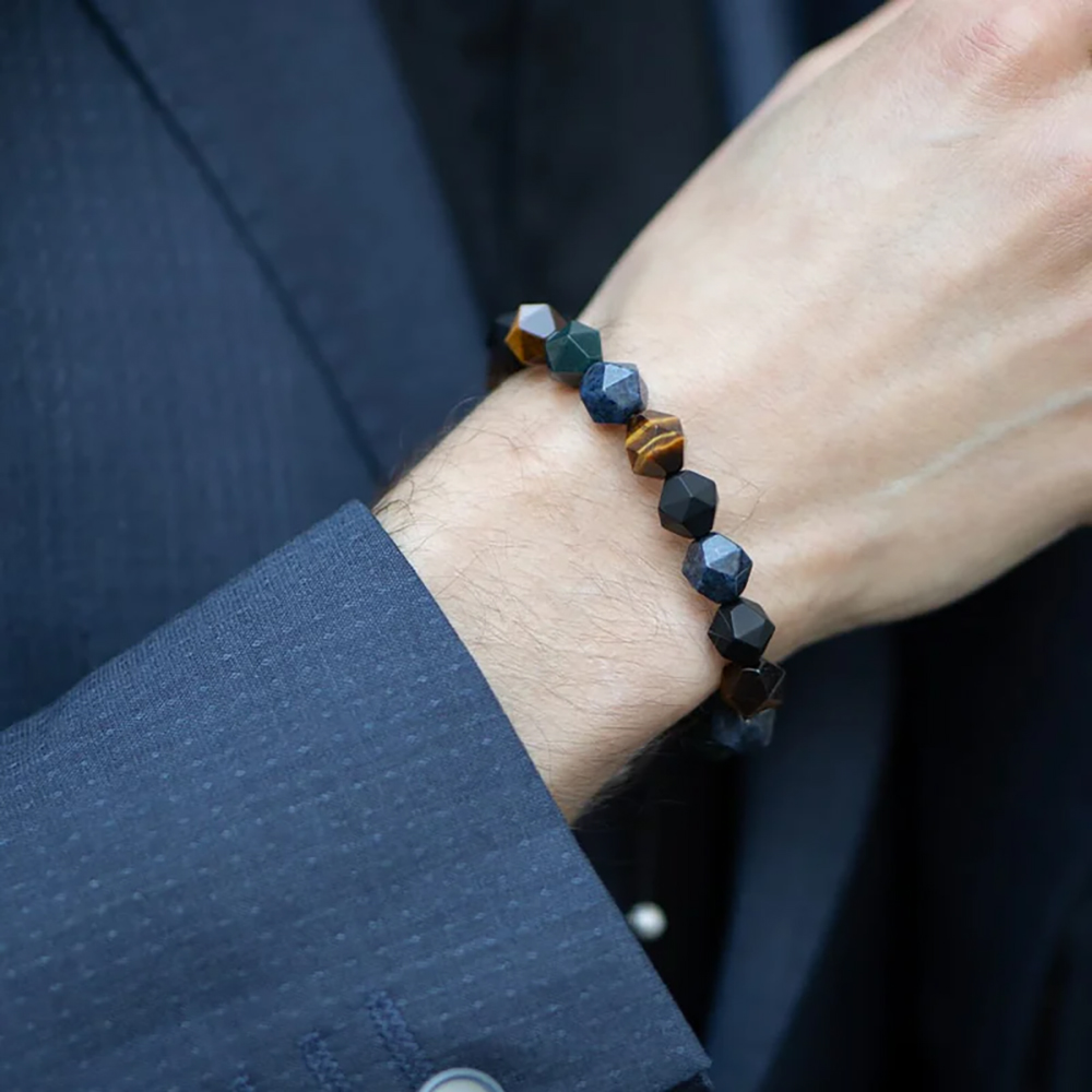 This bracelet brings together rare gemstones sourced from around the world, including Brazilian black agate, South African tiger eye, Madagascar blue line stone, and Nepalese bloodstone jasper. Each stone is shaped into a ten millimeter twenty facet star cut, releasing a refined brilliance that sparkles like scattered starlight.