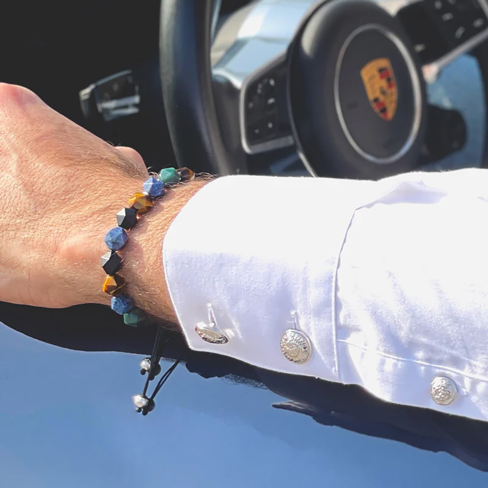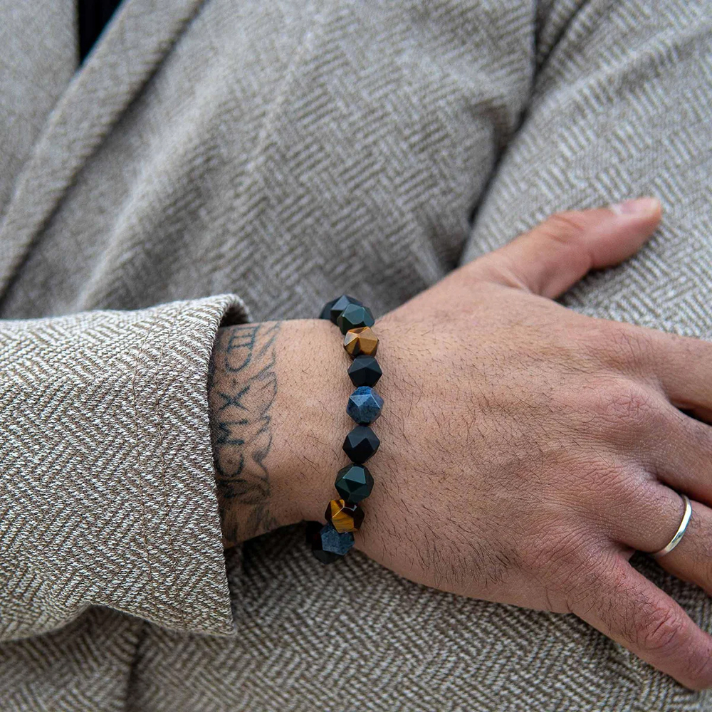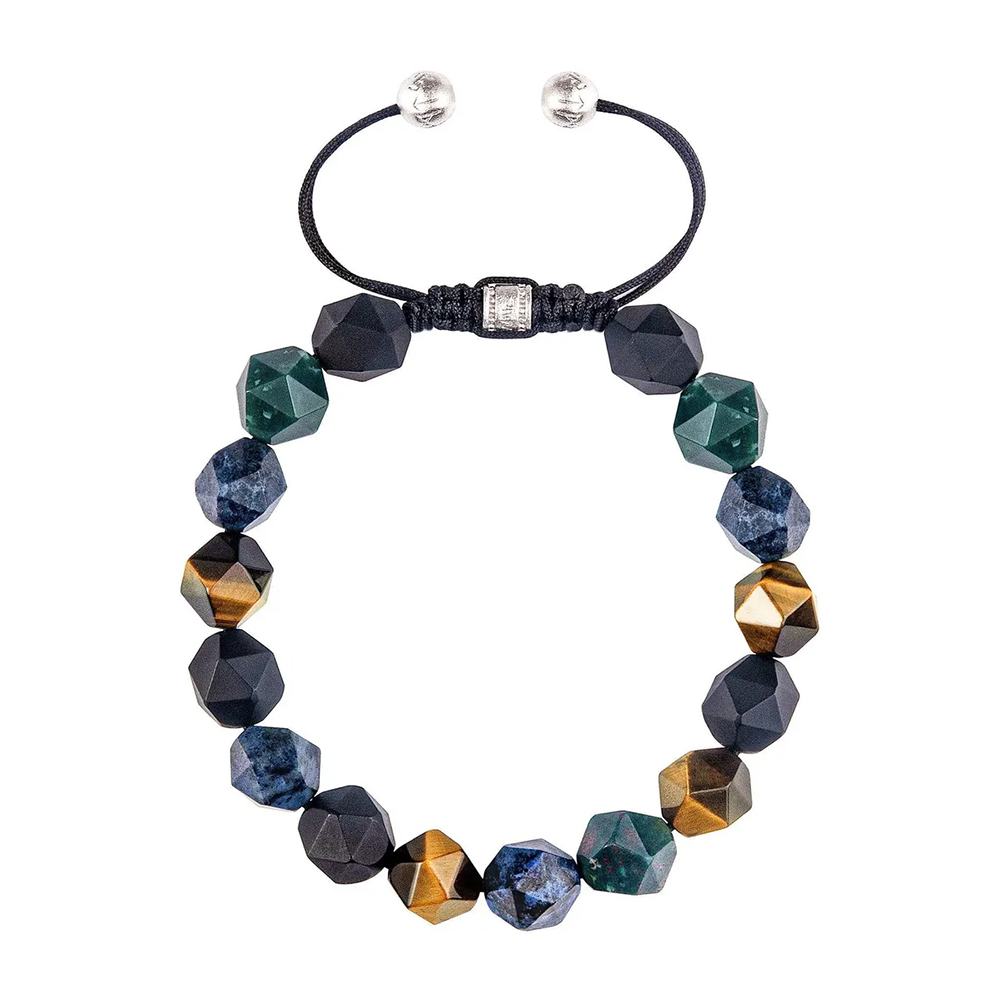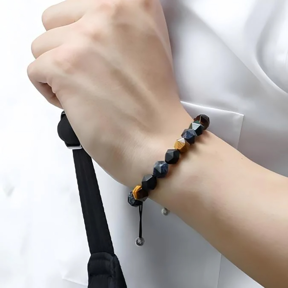 This bracelet brings together rare gemstones sourced from around the world, including Brazilian black agate, South African tiger eye, Madagascar blue line stone, and Nepalese bloodstone jasper. Each stone is shaped into a ten millimeter twenty facet star cut, releasing a refined brilliance that sparkles like scattered starlight.