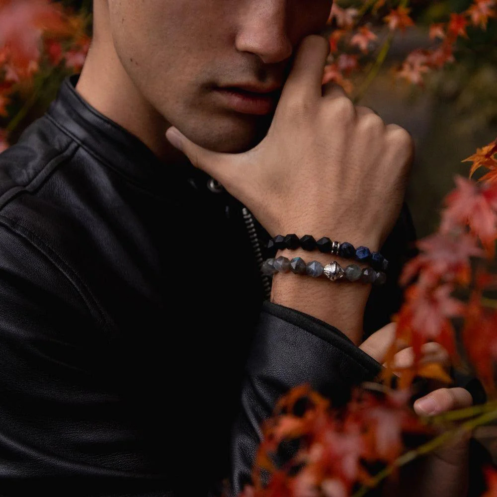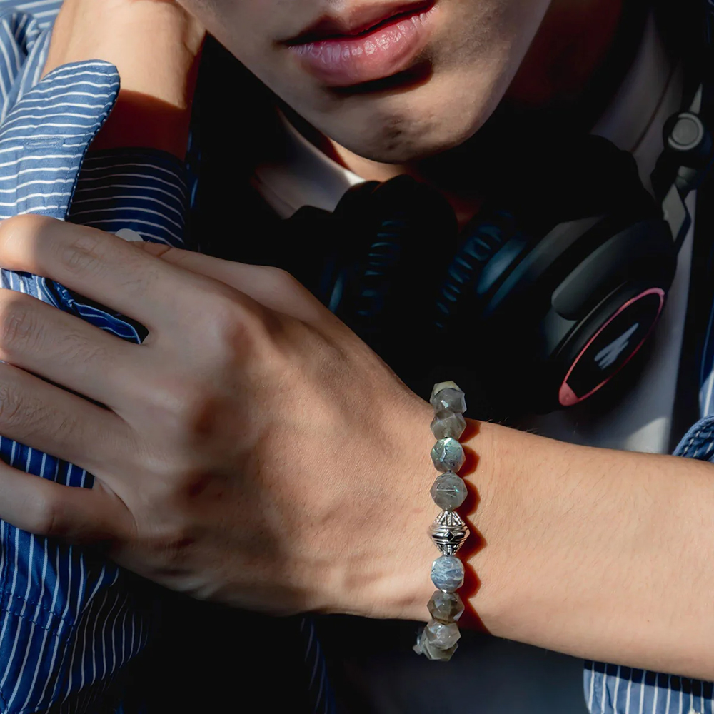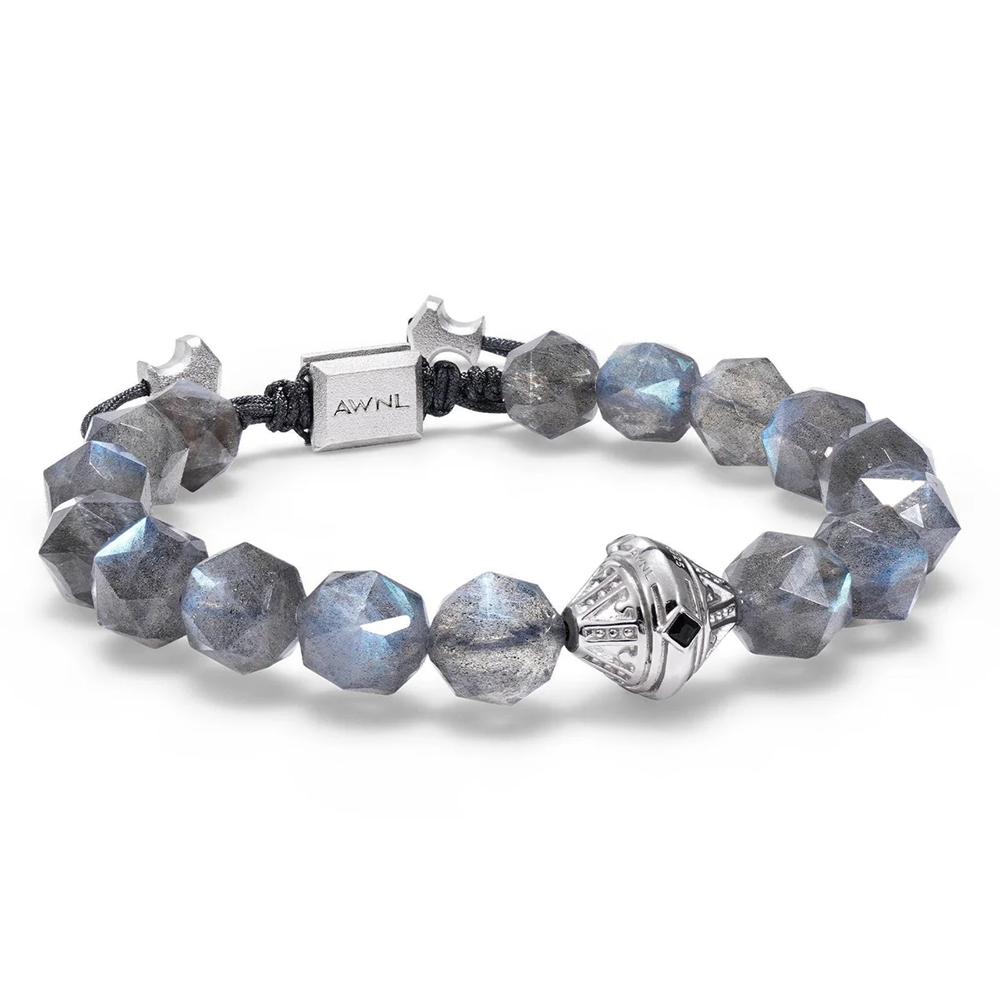 Crafted with S925 silver plated in white gold, the bracelet features ten millimeter Finnish spectrolite beads and an adjustable woven sliding clasp. The eighty four facet cutting technique ensures lasting brilliance, comfort, and timeless appeal.