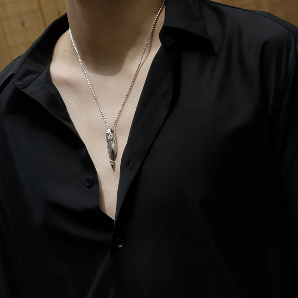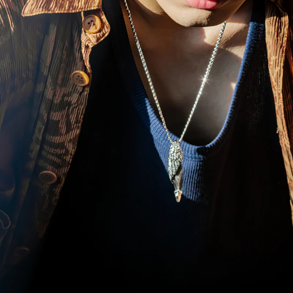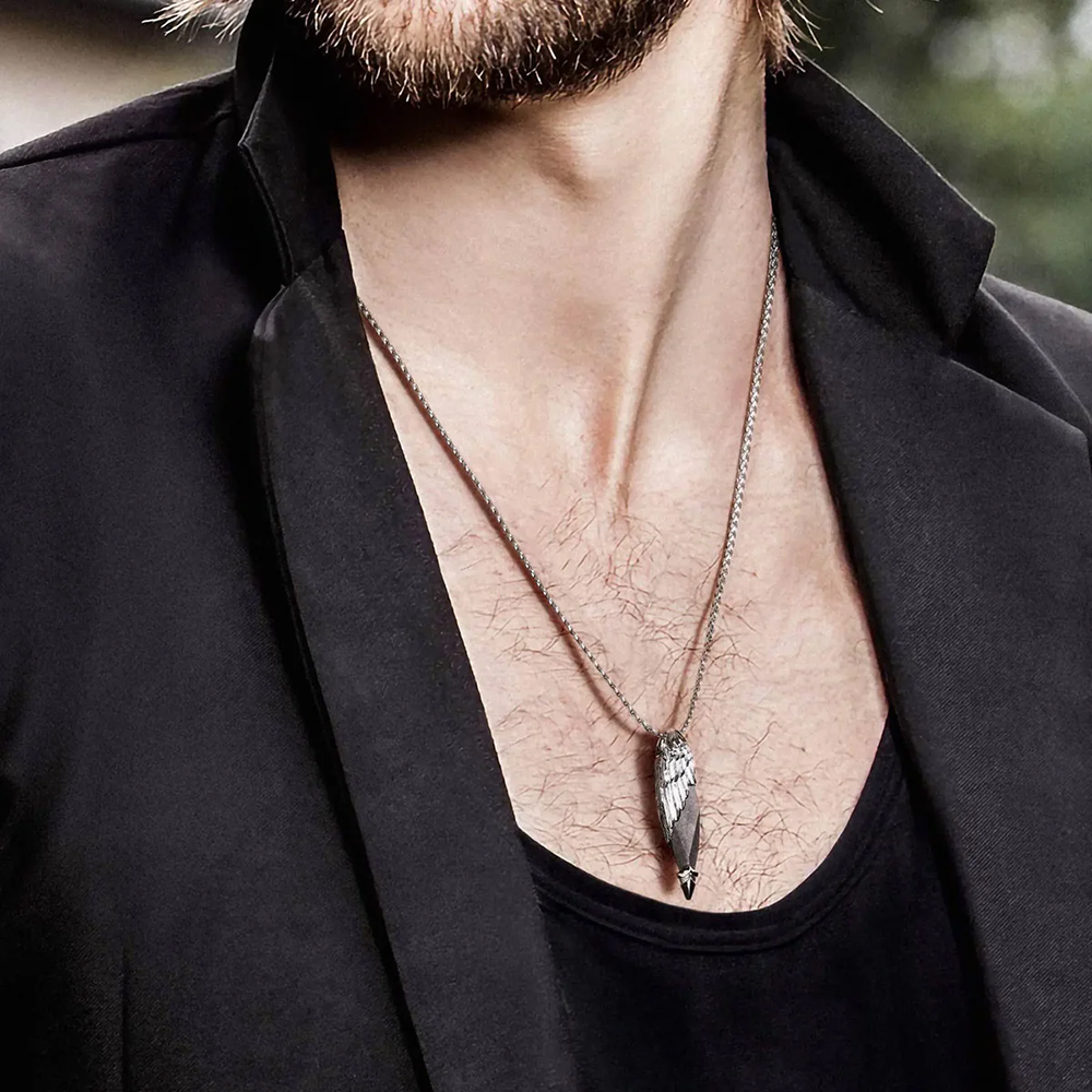 The design draws inspiration from ancient mythology, where seraphic guardians stood watch as warriors of both mercy and judgment. This necklace brings that duality to the chest, allowing stillness and motion to exist side by side.