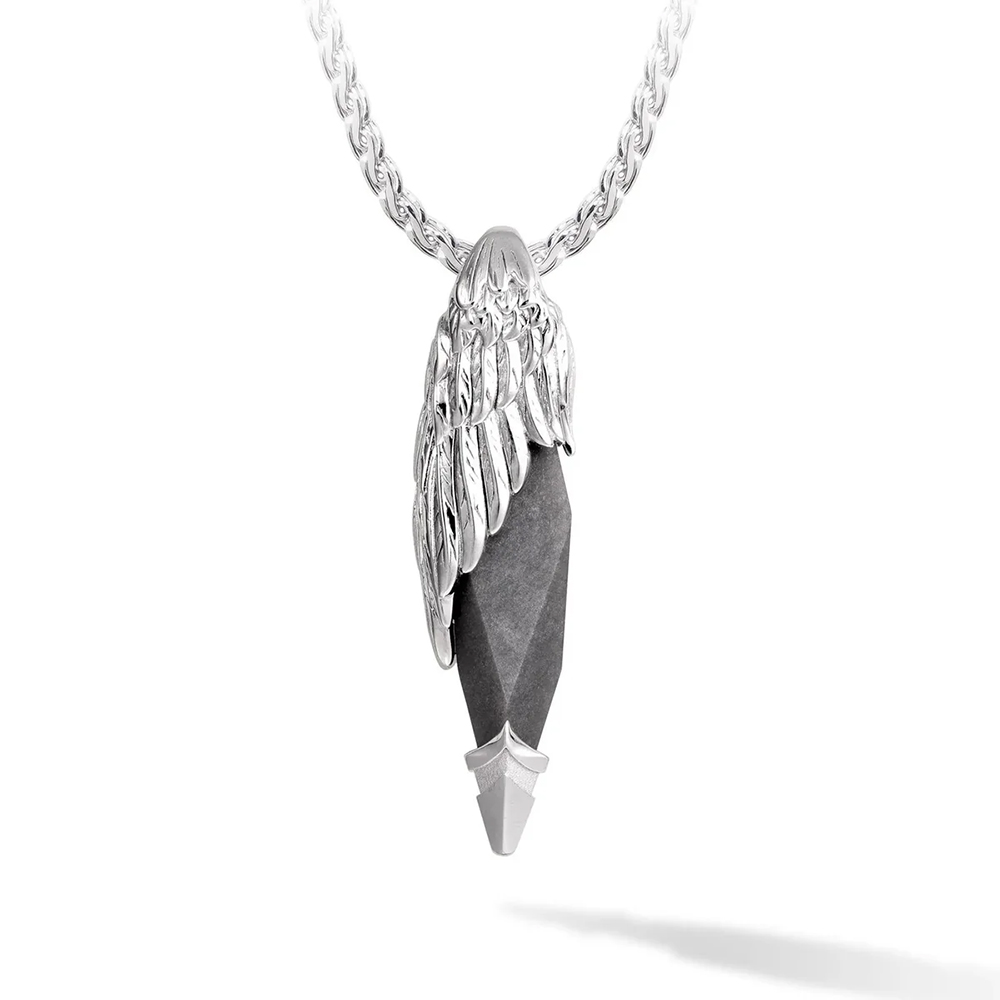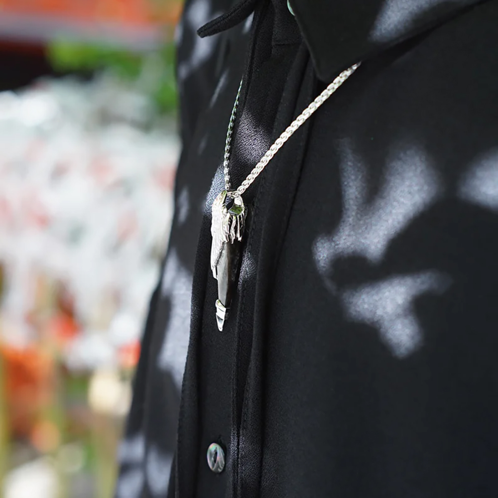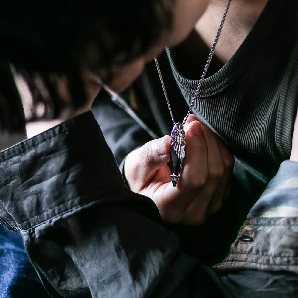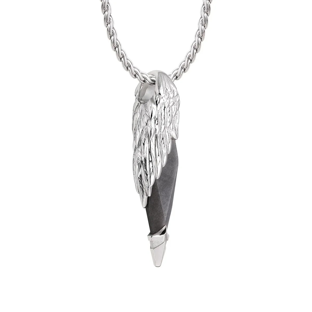 The design draws inspiration from ancient mythology, where seraphic guardians stood watch as warriors of both mercy and judgment. This necklace brings that duality to the chest, allowing stillness and motion to exist side by side.
