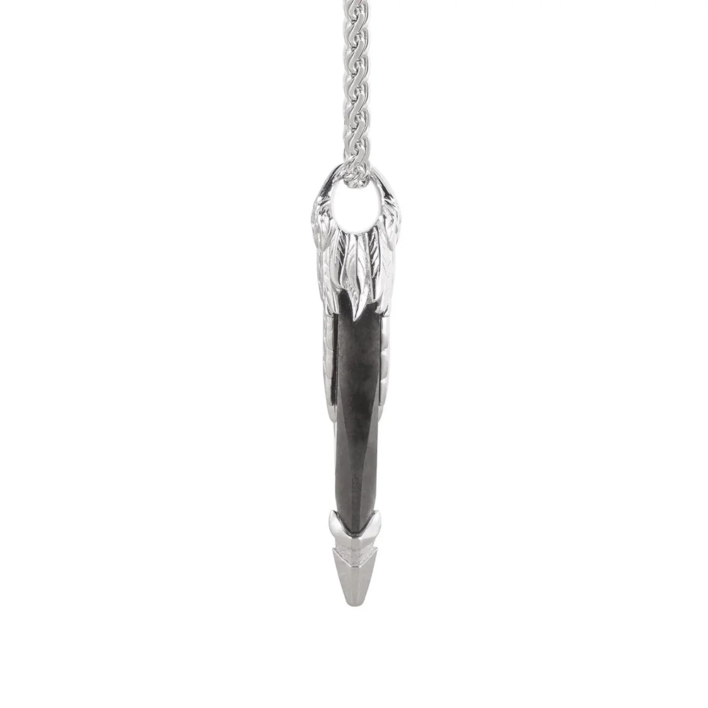 The silver obsidian spike cuts downward like a black bolt breaking through heavy clouds. Set beside a solid silver angel wing, the composition creates a striking visual tension between shadow and radiance.